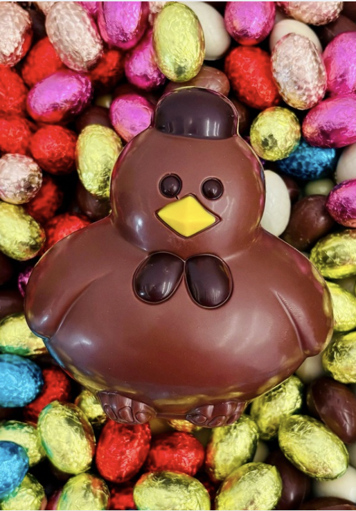 Augustin le Poussin, moulage creux avec son enrobage de chocolat pur origine, au lait 40% de cacao et son décor au chocolat noir 68%.