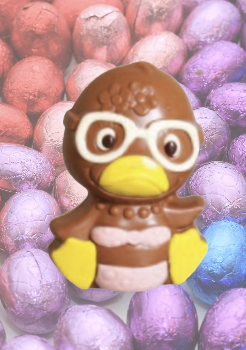 Odette la canette, moulage creux avec un enrobage de chocolat pur origine, au lait 40% de cacao.