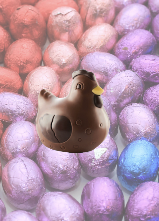 Roule ma poule ! Notre poule, moulage creux avec son enrobage de chocolat pur origine, au lait 40% de cacao.